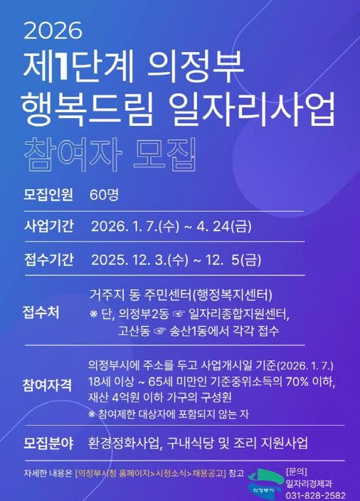 [»çȸ] ÀÇÁ¤ºÎ½Ã, 2026³â Á¦1´Ü°è ÀÇÁ¤ºÎ Çູµå¸² ÀÏÀÚ¸®»ç¾÷ Âü¿©ÀÚ ¸ðÁý |2025. 11.27