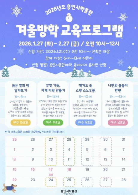 [»çȸ] ¿ëÀνùڹ°°ü, °Ü¿ï¹æÇÐ ¾î¸°ÀÌ ¿ª»ç¡¤¹®È­ üÇè ±³À° ¿î¿µ |2026. 01.20
