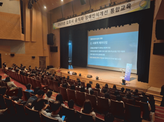[NWS¹æ¼Û=Çѽ¸ñ ±âÀÚ]±èÆ÷½Ã´Â Áö³­ 23ÀÏ ±èÆ÷¾ÆÆ®È¦ °ø¿¬Àå¿¡¼­ Àü Á÷¿øÀ» ´ë»óÀ¸·Î Àå¾Ö ÀÎ½Ä °³¼± ±³À°À» ½Ç½ÃÇß´Ù. À̹ø ±³À°Àº ¹ýÁ¤ Àǹ«±³À°À¸·Î, Àå¾Ö¿¡ ´ëÇÑ ¿Ã¹Ù¸¥ ÀÌÇØ¸¦ È®»ê½ÃŰ°í °øÁ÷»çȸÀÇ ÀÎ½Ä ÀüȯÀ» ÅëÇØ Àå¾ÖÀΰú ¡¦