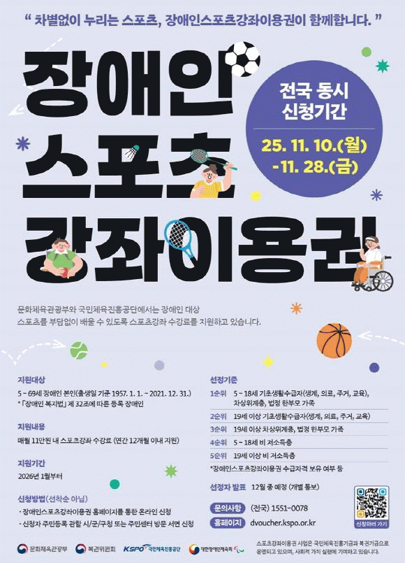 [NWS¹æ¼Û=Çѽ¸ñ ±âÀÚ]ÀÇÁ¤ºÎ½Ã´Â 11¿ù 28ÀϱîÁö Àå¾ÖÀνºÆ÷Ã÷°­ÁÂÀÌ¿ë±Ç Áö¿ø ´ë»óÀÚ ½Åû Á¢¼ö¸¦ ½Ç½ÃÇÑ´Ù. Àå¾ÖÀνºÆ÷Ã÷°­ÁÂÀÌ¿ë±Ç Áö¿ø»ç¾÷Àº °ü³» 5~69¼¼±îÁöÀÇ Àå¾ÖÀÎÀ» ´ë»óÀ¸·Î 1ÀÎ´ç ¿ù 11¸¸ ¿ø ¹üÀ§ ³» °­Á ¼ö°­·á¸¦ Áö¿øÇϴ¡¦