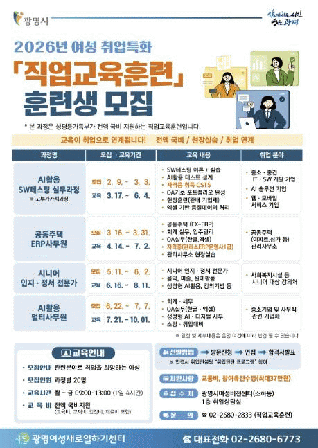 [NWS¹æ¼Û=Çѽ¸ñ ±âÀÚ]±¤¸í½Ã°¡ °æ·Â´ÜÀý ¿©¼º°ú ÀçÃë¾÷ Èñ¸Á ¿©¼ºÀÇ °æÁ¦È°µ¿ º¹±Í¸¦ µ½±â À§ÇØ ¡®2026³â ¸ÂÃãÇü Á÷¾÷±³À°ÈƷᯠ°úÁ¤À» ¿î¿µÇÑ´Ù. ½Ã´Â ¿À´Â 2¿ù 9ÀϺÎÅÍ Ã¹ ±³À°°úÁ¤ ¸ðÁýÀ» ½ÃÀÛÀ¸·Î ¿©¼ºµéÀÇ Ãë¾÷ ¿ª·® °­È­¸¦ À§ÇÑ¡¦