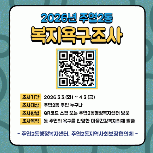 [NWS¹æ¼Û=Çѽ¸ñ ±âÀÚ]°í¾çƯ·Ê½Ã Àϻ꼭±¸ ÁÖ¿±2µ¿Àº ÁÖ¹ÎÀÌ ÇÔ²² ¸¸µå´Â ¡®2026³â ÁÖ¿±2µ¿ ¸¶À»°Ç°­º¹Áö°èȹ¡¯ ¼ö¸³¡¤ÃßÁøÀ» À§ÇØ 3¿ù 3ÀϺÎÅÍ 4¿ù 3ÀϱîÁö ÁֹΠº¹Áö¿å±¸Á¶»ç¸¦ ½Ç½ÃÇÑ´Ù. À̹ø Á¶»ç´Â ¿ì¸® µ¿³×ÀÇ °Ç°­¡¤º¹Áö ÇöȲÀ»¡¦
