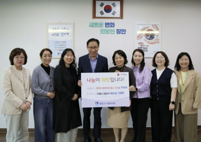 [NWS¹æ¼Û=Çѽ¸ñ ±âÀÚ]¼ö¿ø½Ã ¾î¸°ÀÌÁý¿¬ÇÕȸ Àå¾È±¸È¸´Â Áö³­ 15ÀÏ, ¸¸¼®°Å »õºûÃàÁ¦ ¾Æ³ª¹Ù´Ù ºÎ½º ¿î¿µ ¼öÀÍ±Ý 70¸¸¿øÀ» Àå¾È±¸¿¡ Àü´ÞÇß´Ù. ¾î¸°ÀÌÁý Çкθð ¹× º¸À°±³Á÷¿øÀÌ Áö³­ 4ÀÏ ÁøÇàµÈ ¸¸¼®°Å »õºûÃàÁ¦¿¡¼­ ¾Æ³ª¹Ù´Ù ºÎ½º ¿î¡¦