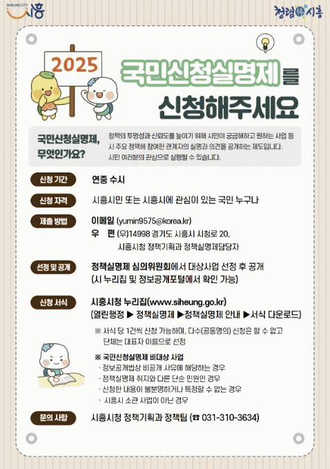 [NWS¹æ¼Û=Çѽ¸ñ ±âÀÚ]½ÃÈï½Ã´Â Á¤Ã¥ÀÇ Åõ¸í¼º°ú Ã¥ÀÓ¼ºÀ» °­È­Çϱâ À§ÇØ 2025³âµµ Á¤Ã¥ ½Ç¸íÁ¦¸¦ ½ÃÇàÇϰí, ¾Æ¿ï·¯ ÀÌÀÇ ÀÏȯÀ¸·Î ±¹¹Î ¼ö¿ä¸¦ ¹Ý¿µÇÑ ¡®±¹¹Î½Åû½Ç¸íÁ¦¡¯¸¦ »ó½Ã ¿î¿µÇÑ´Ù. Á¤Ã¥ ½Ç¸íÁ¦´Â ÁÖ¿ä Á¤Ã¥ °áÁ¤°ú ÁýÇà°úÁ¤¿¡¡¦