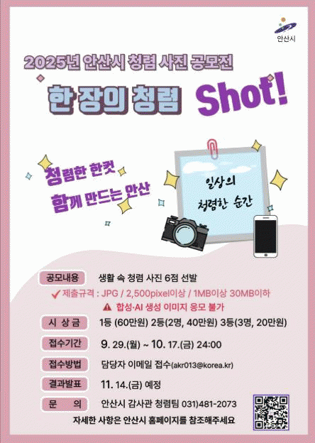 [NWS¹æ¼Û=Çѽ¸ñ ±âÀÚ]¾È»ê½Ã´Â û·Å¹®È­ È®»ê°ú ½Ã¹Î °ø°¨´ë Çü¼ºÀ» À§ÇØ ¡®2025 ÇÑ ÀåÀÇ Ã»·Å, Shot! »çÁø °ø¸ðÀü¡¯À» °³ÃÖÇÑ´Ù°í 30ÀÏ ¹àÇû´Ù. À̹ø °ø¸ðÀü¿¡¼­´Â ¡®Ã»·ÅÇÑ ÇÑ ÄÆ, ÇÔ²² ¸¸µå´Â û·Å¾È»ê¡¯À» ÁÖÁ¦·Î, ½Ã¹ÎµéÀÌ Àϻ󿡡¦