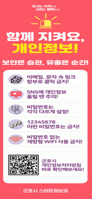 [NWS¹æ¼Û=Çѽ¸ñ ±âÀÚ]±ºÆ÷½Ã´Â 9¿ù 30ÀÏ ¡®°³ÀÎÁ¤º¸ º¸È£ÀÇ ³¯¡¯À» ¸Â¾Æ ½Ã¹ÎµéÀÇ °³ÀÎÁ¤º¸ º¸È£ ÀνÄÀ» ³ôÀÌ°í »ýȰ ¼Ó º¸È£ ¹®È­¸¦ È®»êÇϱâ À§ÇØ ¡®2025³â °³ÀÎÁ¤º¸ º¸È£ÀÇ ³¯ ±â³ä Ä·ÆäÀΡ¯À» 9¿ù 24ÀϺÎÅÍ 10¿ù 2ÀϱîÁö ÃßÁøÇÑ´Ù. ¡¦