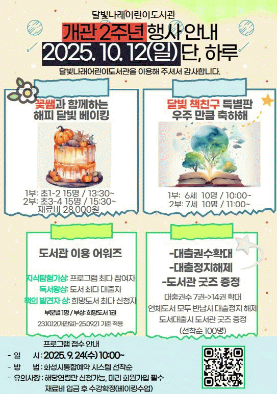 [»çȸ] È­¼º½Ã¸³ ´Þºû³ª·¡¾î¸°À̵µ¼­°ü, °³°ü 2ÁÖ³â ¸Â¾Æ Æ¯º°ÇÑ 10¿ù ÇÁ·Î±×·¥ ¿î¿µ |2025. 09.30