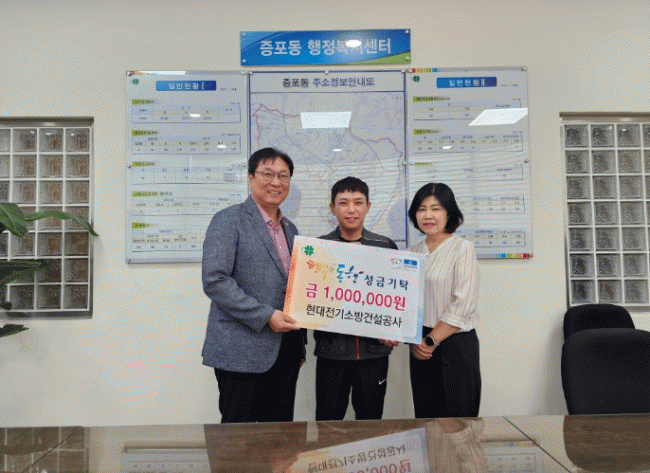 [NWS¹æ¼Û=Çѽ¸ñ ±âÀÚ]ÀÌõ½Ã ÁõÆ÷µ¿Àº 9¿ù 29ÀÏ, Ãß¼® ¸íÀýÀ» ¾ÕµÎ°í ÀÌõ½Ã¿¡ ÀÖ´Â Çö´ëÀü±â¼Ò¹æ°Ç¼³°ø»ç°¡ ¡®ÇູÇÑ µ¿Ç࡯ ¼º±Ý 100¸¸ ¿øÀ» ±âŹÇß´Ù°í ¹àÇû´Ù. Çö´ëÀü±â¼Ò¹æ°Ç¼³°ø»ç´Â Áö¿ª ³» Ãë¾à°èÃþ¿¡ µµ¿òÀ» ÁÖ±â À§ÇØ 2010³â¡¦
