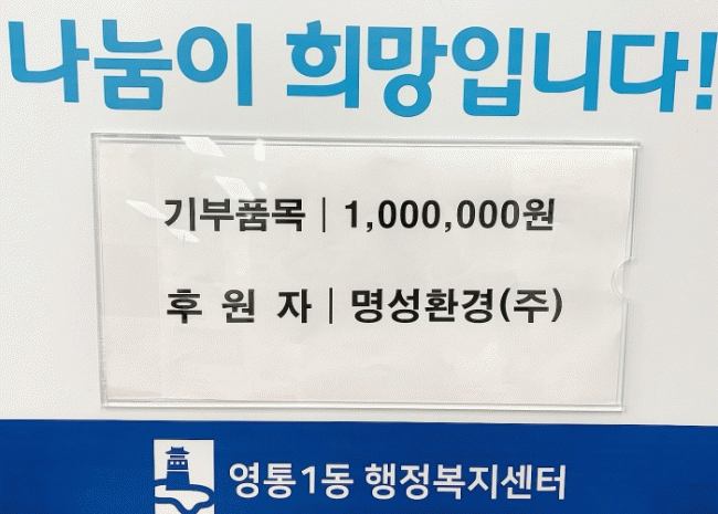 [NWS¹æ¼Û=Çѽ¸ñ ±âÀÚ]Áö³­ 17ÀÏ, ¸í¼ºÈ¯°æ(ÁÖ)Àº Ãß¼® ¸íÀýÀ» ¸ÂÀÌÇÏ¿© ¾î·Á¿î ÀÌ¿ô¿¡°Ô Àü´ÞÇØ ´Þ¶ó¸ç ¼º±Ý 100¸¸¿øÀ» °æ±â»çȸº¹Áö°øµ¿¸ð±Ýȸ¸¦ ÅëÇØ ¿µÅë1µ¿¿¡ ±âŹÇß´Ù. ¸í¼ºÈ¯°æ(ÁÖ)Àº ¼ö¿ø½Ã û¼Ò ´ëÇà¾÷ü·Î¼­ ¼ö¿ø½Ã¿Í Çù·ÂÇù¡¦