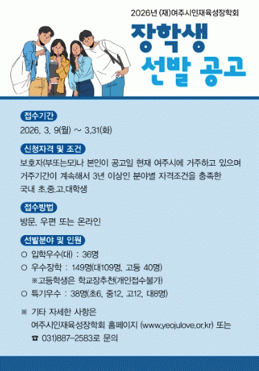 [NWS¹æ¼Û=Çѽ¸ñ ±âÀÚ](Àç)¿©ÁÖ½ÃÀÎÀçÀ°¼ºÀåÇÐȸ´Â ¡®2026³â ¿©ÁÖ½ÃÀÎÀçÀ°¼ºÀåÇÐȸ ÀåÇлý ¼±¹ß°ø°í¡¯¸¦ ¿©ÁÖ½ÃÀÎÀçÀ°¼ºÀåÇÐȸ ȨÆäÀÌÁö ¹× ¿©ÁÖ½Ãû ȨÆäÀÌÁö¿¡ °Ô½ÃÇß´Ù ¿ÃÇØ ¼±¹ßÀοøÀº ÀÔÇпì¼ö 36¸í, ¿ì¼ö 149¸í, Ư±â¿ì¼ö 38¸í, ¡¦