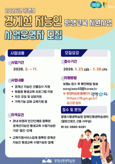 [NWS¹æ¼Û=Çѽ¸ñ ±âÀÚ]±¤¸í½Ã´Â ¡®2026³â ±¤¸í½Ã °æ°è¼±Áö´ÉÀÎ Æò»ý±³À° ¿î¿µ Áö¿ø»ç¾÷¡¯À» ¼öÇàÇÒ º¸Á¶»ç¾÷ÀÚ¸¦ ¿À´Â 28ÀϱîÁö °ø°³ ¸ðÁýÇÑ´Ù. À̹ø »ç¾÷Àº ÁöÀûÀå¾Ö¿¡ ÇØ´çÇÏÁö´Â ¾ÊÁö¸¸ ÀÎÁö ¹× ÇнÀ ´É·ÂÀÇ ºÎÁ·À¸·Î »çȸ ÀûÀÀ¿¡ ¾î¡¦