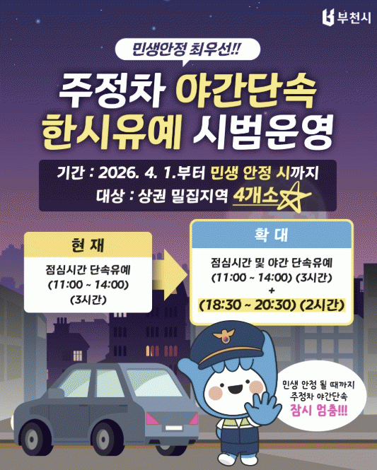 [NWS¹æ¼Û=Çѽ¸ñ ±âÀÚ]ºÎõ½Ã´Â ¿À´Â 4¿ùºÎÅÍ »ó±Ç ¹ÐÁý Áö¿ª 4°÷¿¡¼­ ¾ß°£ ÁÖÁ¤Â÷ ´Ü¼ÓÀ» ÇѽÃÀûÀ¸·Î À¯¿¹ÇÏ´Â ½Ã¹ü »ç¾÷À» ÃßÁøÇÑ´Ù°í ¹àÇû´Ù. ÀÌ´Â ±âÁ¸ Á¡½É½Ã°£ ´Ü¼Ó À¯¿¹ Á¤Ã¥À» È®´ëÇÑ °ÍÀ¸·Î, ½Ã¹ÎµéÀÇ »ó±Ç ÀÌ¿ë ÆíÀǼºÀ» ÇÑÃþ ¡¦
