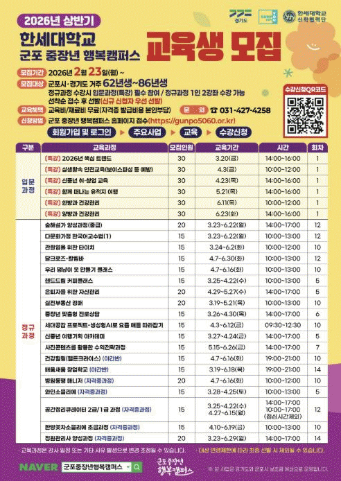 [NWS¹æ¼Û=Çѽ¸ñ ±âÀÚ]±ºÆ÷½Ã°¡ Àλý 2¸· ¼³°è¿Í »çȸÂü¿© È®´ëÀÇ ±âȸ¸¦ Á¦°øÇϰíÀÚ ÁßÀå³â ¼¼´ë¸¦ ´ë»óÀ¸·Î 2026³â »ó¹Ý±â ÁßÀå³â ÇູķÆÛ½º ±³À°»ýÀ» ¸ðÁýÇÑ´Ù°í ¹àÇû´Ù. À̹ø ±³À°Àº ÁßÀå³âÃþÀÇ ¿ª·® °­È­¿Í Àçµµ¾àÀ» µ½±â À§ÇÑ ¸Â¡¦