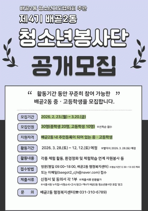 [»çȸ] ½ÃÈï½Ã ¹è°ð2µ¿ û¼Ò³âÁöµµÇùÀÇȸ, Á¦4±â ¹è°ð2µ¿ û¼Ò³âºÀ»ç´Ü ¸ðÁý |2026. 02.25