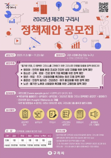 [NWS¹æ¼Û=Çѽ¸ñ ±âÀÚ]±¸¸®½Ã´Â ¿À´Â 11¿ù 3ÀϺÎÅÍ 11¿ù 23ÀϱîÁö'2025³â Á¦2ȸ ±¸¸®½Ã Á¤Ã¥ Á¦¾È °ø¸ðÀü'À» °³ÃÖÇÑ´Ù°í ¹àÇû´Ù. À̹ø °ø¸ðÀüÀÇ ÁÖÁ¦´Â ¡®±¸¸® ½Ã¹Î(¿µÀ¯¾Æ¡¤Ã»¼Ò³â¡¤Ã»³â¡¤ÁßÀå³â¡¤³ë³â) ³ªÀ̺° ¸ÂÃãÇü Á¤Ã¥ ¾ÆÀ̵ð¾î¡¯´Ù¡¦