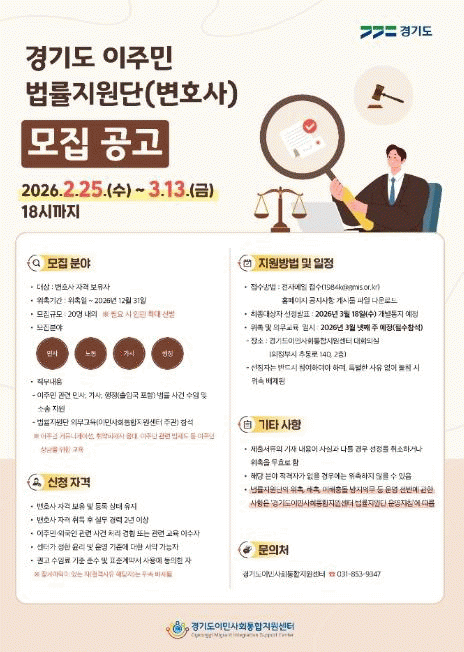[»çȸ] °æ±âµµ, ÀÌÁֹΠ¹ý·üÁö¿ø´Ü ¿î¿µ¡¦ °ø°ø ¹ý·üÁö¿ø À§ÇÑ º¯È£»ç ¸ðÁý |2026. 02.25