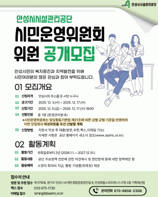 [»çȸ] ¾È¼º½Ã½Ã¼³°ü¸®°ø´Ü, ½Ã¹Î¿î¿µÀ§¿øÈ¸ ¿î¿µÀ§¿ø °ø°³ ¸ðÁý |2025. 12.08