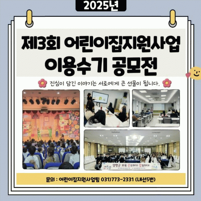 [NWS¹æ¼Û=Çѽ¸ñ ±âÀÚ]¾çÆò±ºÀ°¾ÆÁ¾ÇÕÁö¿ø¼¾ÅÍ´Â °ü³» ¿µÀ¯¾Æ Àڳฦ µÐ °¡Á¤°ú ¾î¸°ÀÌÁýÀ» ´ë»óÀ¸·Î ¡®Á¦3ȸ ÀÌ¿ë¼ö±â °ø¸ðÀü¡¯À» °³ÃÖÇÑ´Ù°í ¹àÇû´Ù. À̹ø °ø¸ðÀüÀº ¼¾ÅÍ ÀÌ¿ë °æÇèÀ» ³ª´©°í, ±× °úÁ¤¿¡¼­ ´À³¤ º¯È­¿Í ¼ºÀåÀ» °øÀ¯Çϴ¡¦