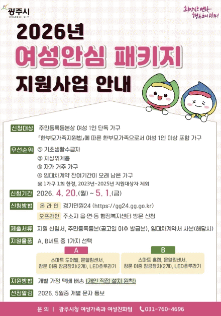 [»çȸ] ±¤ÁÖ½Ã, ¿©¼º ¾È½É ÆÐŰÁö Áö¿ø ´ë»óÀÚ 35°¡±¸ ¸ðÁý |2026. 04.17