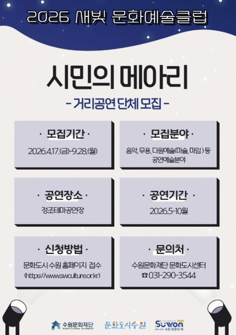 [»çȸ] ¼ö¿ø¹®È­Àç´Ü, »õºû ¹®È­¿¹¼úŬ·´ '½Ã¹ÎÀÇ ¸Þ¾Æ¸®' °ø¿¬´Üü ¸ðÁý |2026. 04.17