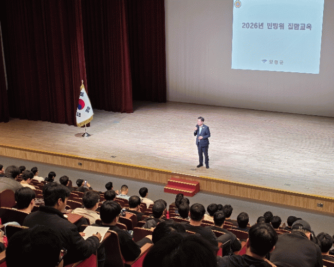 [NWS¹æ¼Û=Çѽ¸ñ ±âÀÚ]¾çÆò±ºÀº Áö³­ 20ÀÏ ¾çÆòµµ¼­°ü ¹°ºû±ØÀå¿¡¼­ °ü³» ¹Î¹æÀ§´ë¿øÀ» ´ë»óÀ¸·Î ¡®2026³â ¹Î¹æÀ§ ÁýÇÕ±³À°¡¯À» ½Ç½ÃÇß´Ù. À̹ø ±³À°Àº ¹Î¹æÀ§ ±âº», È­»ý¹æ ´ëºñ, ÀÀ±Þóġ, È­Àç ´ëºñ µî 4°³ ±âº» °ú¸ñ°ú ÇÔ²² ½ÉÆó¼Ò»ý¡¦