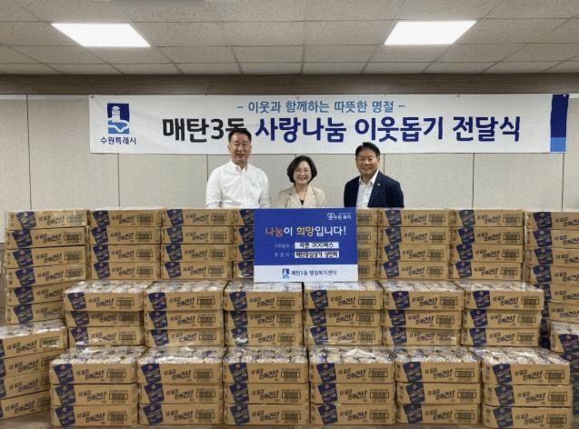 [NWS¹æ¼Û=Çѽ¸ñ ±âÀÚ]¼ö¿ø½Ã ¿µÅ뱸 ¸Åź2µ¿Àº Áö³­ 22ÀÏ, Ãß¼® ¸íÀýÀ» ¸ÂÀÌÇÏ¿© ¸ÅźÁß½É»ó°¡ »óÀÎȸ¿Í ÇÔ²² ÄŶó¸é 100»óÀÚ Àü´Þ½ÄÀ» ÁøÇàÇß´Ù. ¸ÅźÁß½É»ó°¡ »óÀÎȸ´Â ¸Å³â ¸íÀý¸¶´Ù ¸Åź2µ¿ÀÇ Àú¼Òµæ °¡±¸¸¦ À§ÇÑ ¹°Ç°À» ²ÙÁØÈ÷ ÈÄ¡¦