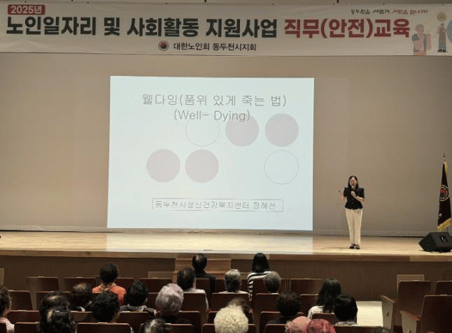 [NWS¹æ¼Û=Çѽ¸ñ ±âÀÚ]µ¿µÎõ½ÃÁ¤½Å°Ç°­º¹Áö¼¾ÅÍ´Â 9¿ù 19ÀÏ µ¿µÎõ½Ã¹Îȸ°ü¿¡¼­ ³ëÀÎ ÀÏÀÚ¸® ¹× »çȸȰµ¿ Áö¿ø»ç¾÷ Âü¿© ¾î¸£½ÅÀ» ´ë»óÀ¸·Î ¡®À£´ÙÀ×(Well-dying)¡¯À» ÁÖÁ¦·Î ÇÑ ¼ºÀÎ Á¤½Å°Ç°­ ±³À°À» ÁøÇàÇß´Ù. À̹ø ±³À°Àº ´Ü¼øÇÑ ¾È¡¦