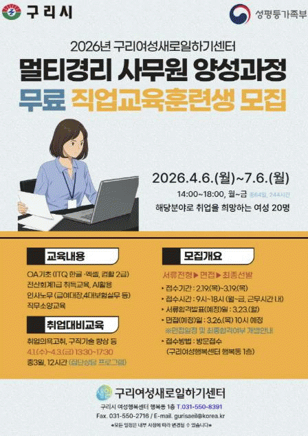 [NWS¹æ¼Û=Çѽ¸ñ ±âÀÚ]±¸¸®½Ã´Â ±¸¸®¿©¼º»õ·ÎÀÏÇϱ⼾ÅÍ¿¡¼­ Ãë¾÷À» Èñ¸ÁÇÏ´Â ¿©¼ºÀ» ´ë»óÀ¸·Î ¿î¿µÇÏ´Â '¸ÖƼ°æ¸® »ç¹«¿ø ¾ç¼º°úÁ¤' ±³À°»ýÀ» ¿À´Â 2¿ù 19ÀϺÎÅÍ ¸ðÁýÇÑ´Ù°í ¹àÇû´Ù. À̹ø °úÁ¤Àº Áß¼Ò±â¾÷ ¹× ¼Ò±Ô¸ð »ç¾÷Àå¿¡¼­ ¿ä±¸ÇÏ¡¦