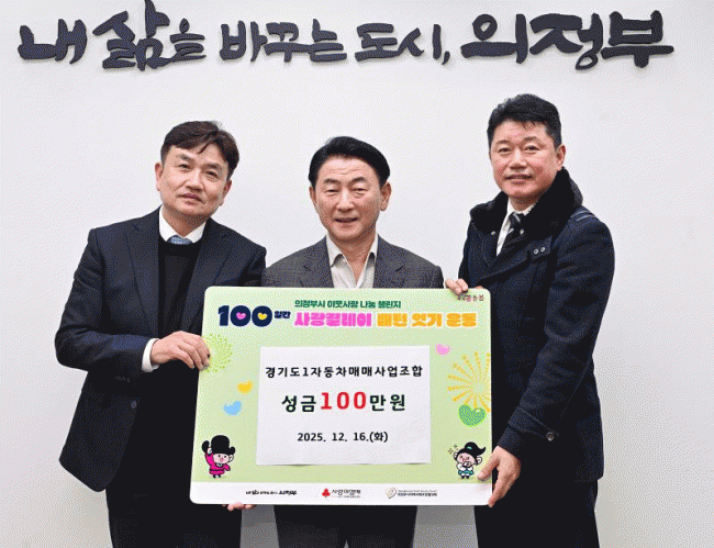 [NWS¹æ¼Û=Çѽ¸ñ ±âÀÚ]ÀÇÁ¤ºÎ½Ã´Â 12¿ù 16ÀÏ °æ±âµµ1ÀÚµ¿Â÷¸Å¸Å»ç¾÷Á¶ÇÕ ÀÇÁ¤ºÎÁöºÎ°¡ Áö¿ª»çȸ ³ª´® ¹®È­ È®»êÀ» À§ÇÑ ¡®100Àϰ£ »ç¶û¸±·¹ÀÌ ¹èÅÏ Àձ⡯¿¡ µ¿ÂüÇØ ¼º±Ý 100¸¸ ¿øÀ» ±âºÎÇß´Ù°í ¹àÇû´Ù. À̹ø ±âºÎ´Â ¼Ò¿ÜµÈ ÀÌ¿ô¿¡°Ô µû¡¦