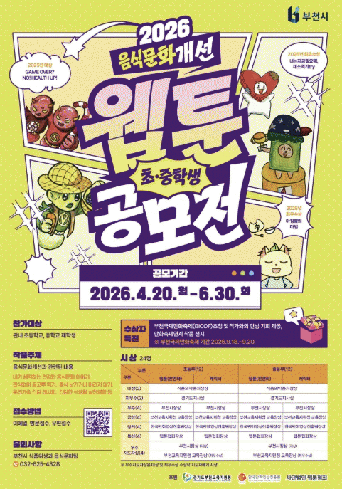 [NWS¹æ¼Û=Çѽ¸ñ ±âÀÚ]ºÎõ½Ã´Â 4¿ù 20ÀϺÎÅÍ 6¿ù 30ÀϱîÁö ¡®2026³â À½½Ä¹®È­°³¼± ÃÊÁßÇлý À¥Å÷¡¤Ä³¸¯ÅÍ °ø¸ðÀü¡¯À» ¿¬´Ù. À̹ø °ø¸ðÀüÀº ÇлýµéÀÌ ÀÏ»ó ¼Ó À½½Ä¹®È­¸¦ ÁÖÁ¦·Î Á÷Á¢ âÀÛ¿¡ Âü¿©ÇÔÀ¸·Î½á ¿Ã¹Ù¸¥ ½Ä¹®È­¿¡ ´ëÇÑ ÀνÄÀ» ³ô¡¦