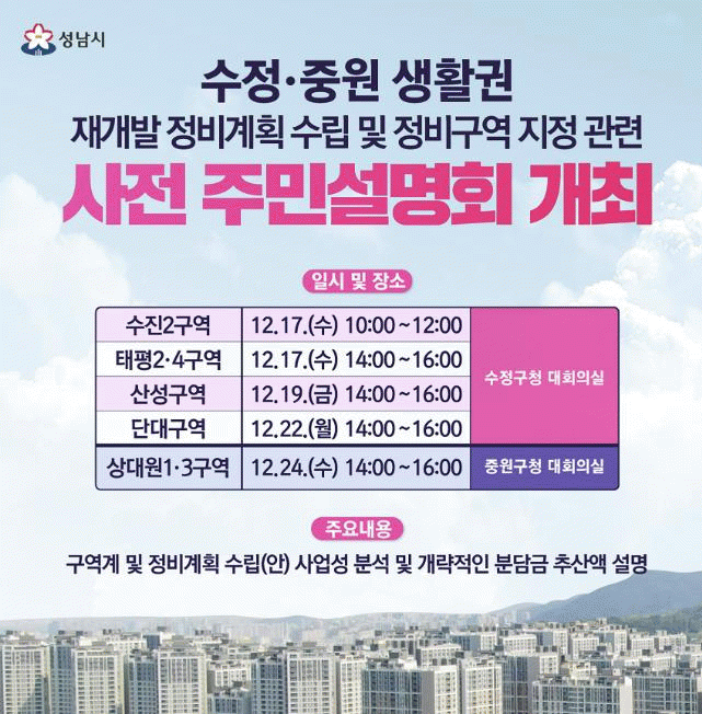 [NWS¹æ¼Û=Çѽ¸ñ ±âÀÚ]¼º³²½Ã´Â ¿À´Â 12¿ù 17ÀÏ ¼öÁø2±¸¿ªÀ» ½ÃÀÛÀ¸·Î ¼öÁ¤¡¤Áß¿ø »ýȰ±Ç 5°³ ±¸¿ªÀÇ Àç°³¹ß Á¤ºñ°èȹ ¼ö¸³ ¹× Á¤ºñ±¸¿ª ÁöÁ¤¿¡ ´ëÇÑ »çÀü Áֹμ³¸íȸ¸¦ ¼øÂ÷ÀûÀ¸·Î °³ÃÖÇÑ´Ù. À̹ø Áֹμ³¸íȸ´Â Áö³­ 9¿ù 23ÀÏ Âø¼öÇÑ ¼ö¡¦