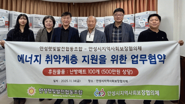 [»çȸ] ¾È¼º½ÃÁö¿ª»çȸº¸ÀåÇùÀÇü, ¾È¼ºÇÞºû¹ßÀüÇùµ¿Á¶ÇÕ°ú ¿¡³ÊÁö Ãë¾à°èÃþ °Ü¿ïö ³­¹æ¿ëǰ Áö¿ø Çù¾à½Ä ÃßÁø |2025. 11.17