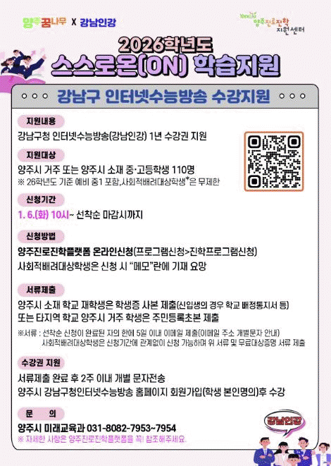[NWS¹æ¼Û=Çѽ¸ñ ±âÀÚ]¾çÁֽð¡ °­³²±¸¿ÍÀÇ ¾÷¹«Çù¾àÀ» ÅëÇØ °ø°ø ¿Â¶óÀÎ ÇнÀ ÄÜÅÙÃ÷¸¦ Ȱ¿ëÇÑ ¡®°­³²Àΰ­ ¼ö°­±Ç Áö¿ø »ç¾÷¡¯À» ÃßÁøÇÑ´Ù. À̹ø »ç¾÷Àº °ü³» û¼Ò³âµéÀÇ °Ü¿ï¹æÇÐ ÇнÀÀ» Áö¿øÇϰí, Áø·Î¡¤ÁøÇÐ Áغñ¿¡ ÇÊ¿äÇÑ ÇнÀ ¿©°Ç¡¦