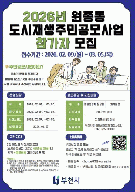 [»çȸ] ºÎõ½Ã, 2026 ¿øÁ¾µ¿ µµ½ÃÀç»ý Áֹΰø¸ð»ç¾÷ Âü°¡ÀÚ ¸ðÁý |2026. 02.09