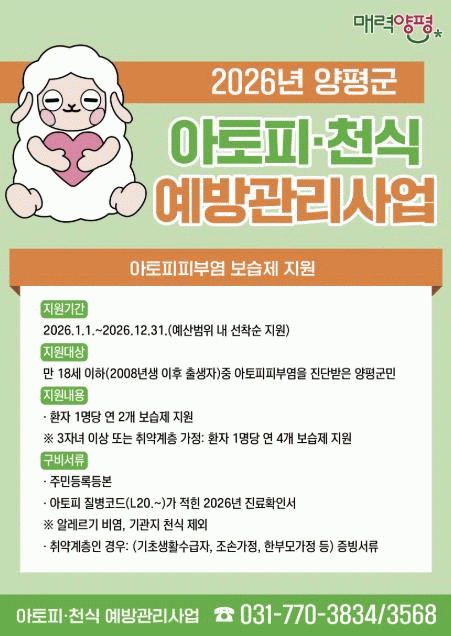 [NWS¹æ¼Û=Çѽ¸ñ ±âÀÚ]¾çÆò±ºÀº Áö¿ª»çȸ Áß½ÉÀÇ ¾Ë·¹¸£±âÁúȯ Á¶±â ¹ß°ß°ú ÀûÀýÇÑ Ä¡·á¸¦ À§ÇØ ¾çÆò±º¹ÎÀ» ´ë»óÀ¸·Î 2026³â ¿¬Áß ¡®¾ÆÅäÇÇÇǺο° º¸½ÀÁ¦ Áö¿ø¡¯°ú ¡®Ãë¾à°èÃþ ¾Ë·¹¸£±âÁúȯ ÀÇ·áºñ Áö¿ø¡¯ »ç¾÷À» ÃßÁøÇÑ´Ù°í ¹àÇû´Ù. ¡®¡¦