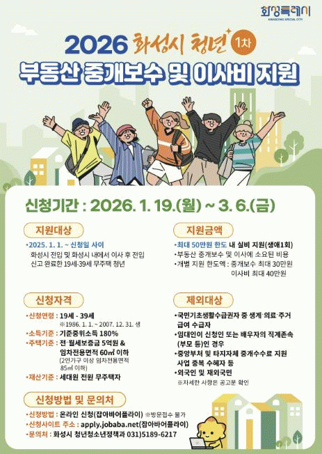 [NWS¹æ¼Û=Çѽ¸ñ ±âÀÚ]È­¼ºÆ¯·Ê½Ã°¡ 19ÀϺÎÅÍ 3¿ù 6ÀϱîÁö û³âµéÀÇ Áְźñ ºÎ´ã °æ°¨ ¹× Á¤ÁÖ ¿©°Ç Çâ»óÀ» À§ÇÑ ¡®2026³â »ó¹Ý±â û³â ºÎµ¿»ê Áß°³º¸¼ö ¹× ÀÌ»çºñ Áö¿ø»ç¾÷¡¯ ½ÅûÀ» ¹Þ´Â´Ù. Áö¿ø ´ë»óÀÚ·Î ¼±Á¤µÇ¸é ÃÖ´ë 50¸¸ ¿ø Çѵµ¡¦