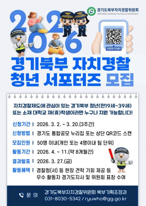 [NWS¹æ¼Û=Çѽ¸ñ ±âÀÚ]°æ±âµµºÏºÎÀÚÄ¡°æÂûÀ§¿øÈ¸´Â ÀÚÄ¡°æÂûÁ¦¿¡ ´ëÇÑ Ã»³âÃþÀÇ °ü½ÉÀ» ³ôÀ̰í ÇöÀå Áß½É Ä¡¾È Ȱµ¿À» ÇÔ²²ÇÒ ¡®2026 °æ±âºÏºÎ ÀÚÄ¡°æÂû û³â ¼­Æ÷ÅÍÁ¸¦ 3¿ù 2ÀϺÎÅÍ 20ÀϱîÁö °ø°³ ¸ðÁýÇÑ´Ù. ¸ðÁý ±Ô¸ð´Â 50¸í À̳»·Î¡¦