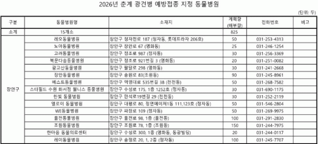 [NWS¹æ¼Û=Çѽ¸ñ ±âÀÚ]¼ö¿ø½Ã Àå¾È±¸´Â 4¿ù 6ÀϺÎÅÍ 4¿ù 26ÀϱîÁö 2026³â Ãá°è ±¤°ßº´ ¿¹¹æÁ¢Á¾À» ÃßÁøÇÑ´Ù°í ¹àÇû´Ù. À̹ø ¿¹¹æÁ¢Á¾ ´ë»óÀº »ýÈÄ 2°³¿ù ÀÌ»ó µ¿¹°µî·ÏµÈ ¹Ý·Á°ß(°³)À̸ç, ¼ö¿ø½Ã °ÅÁÖ ¹Ý·Á°ß ¼ÒÀ¯ÀÚ´Â ÁöÁ¤µÈ µ¿¹°º´¿ø¿¡¡¦