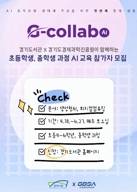 [NWS¹æ¼Û=Çѽ¸ñ ±âÀÚ]°æ±âµµ¼­°üÀº °æ±âµµ°æÁ¦°úÇÐÁøÈï¿ø Çù¾÷ ÇÁ·ÎÁ§Æ® ¡®Áö-Äݶóº¸(G-Collabo)¡¯¸¦ ±âÈÄȯ°æ Á߽ɿ¡¼­ ÀΰøÁö´É(AI) ºÐ¾ß±îÁö È®´ëÇϰí, ¿À´Â 6¿ù±îÁö ÃÊ¡¤Áßµî ´ë»ó ·Îº¿°øÇРüÇè ÇÁ·Î±×·¥À» ¿î¿µÇÑ´Ù. Áö-Äݶ󺸴¡¦