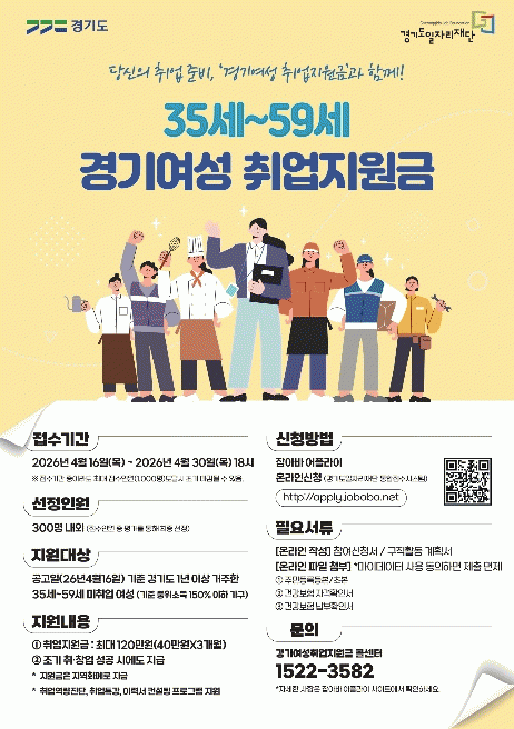 [NWS¹æ¼Û=Çѽ¸ñ ±âÀÚ]°æ±âµµ°¡ °æ·Âº¸À¯¿©¼º µî µµ³» 35~59¼¼ ¹ÌÃë¾÷ ¿©¼ºÀÇ Ãë¾÷À» µ½±â À§ÇØ ¡®2026³â °æ±â¿©¼º Ãë¾÷Áö¿ø±Ý¡¯ Âü¿©ÀÚ 300¸íÀ» ¿À´Â 30ÀϱîÁö ¸ðÁýÇÑ´Ù. ¡®°æ±â¿©¼º Ãë¾÷Áö¿ø±Ý¡¯Àº Ãâ»ê¡¤À°¾Æ¡¤µ¹º½ µîÀ¸·Î °æ·ÂÀÌ ´Ü¡¦