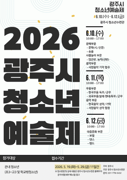 [NWS¹æ¼Û=Çѽ¸ñ ±âÀÚ]±¤Áֽô ¡®2026³â ±¤Áֽà û¼Ò³â¿¹¼úÁ¦¡¯ Âü°¡ÀÚ¸¦ ¸ðÁýÇÑ´Ù°í 20ÀÏ ¹àÇû´Ù. À̹ø ¿¹¼úÁ¦´Â ±¤Áֽð¡ ÁÖÃÖÇÏ°í ±¤Áֽà û¼Ò³â¼ö·Ã°üÀÌ ÁÖ°üÇϸç, 6¿ù 10ÀϺÎÅÍ 12ÀϱîÁö 3Àϰ£ û¼Ò³â¼ö·Ã°ü¿¡¼­ °³ÃֵȴÙ. ¸ðÁý ´ë¡¦