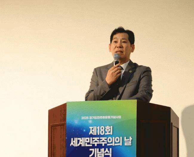 [NWS¹æ¼Û=Çѽ¸ñ ±âÀÚ]°æ±âµµÀÇȸ ¾ÈÀüÇàÁ¤À§¿øÈ¸ ÀÌ¿µºÀ ÀÇ¿ø(´õºÒ¾î¹ÎÁÖ´ç, ÀÇÁ¤ºÎ2)ÀÌ 10¿ù 30ÀÏ °æ±â¾ÆÆ®¼¾ÅÍ ÄÁº¥¼ÇȦ¿¡¼­ ¿­¸° Á¦18ȸ ¼¼°è¹ÎÁÖÁÖÀÇÀÇ ³¯ ±â³ä½Ä¿¡ Âü¼®ÇØ Ãà»ç¸¦ ÀüÇß´Ù. À̹ø ±â³ä½ÄÀº (»ç)¼º³²¹ÎÁÖÈ­¿îµ¿»ç¾÷ȸ¡¦