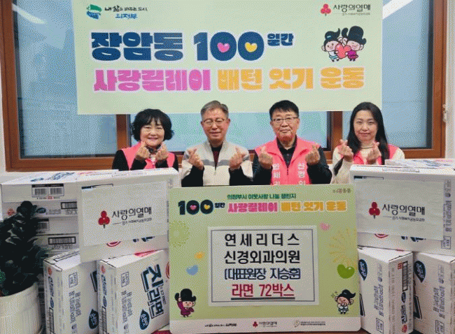 [NWS¹æ¼Û=Çѽ¸ñ ±âÀÚ]ÀÇÁ¤ºÎ½Ã Àå¾Ïµ¿Áֹμ¾ÅÍ´Â 11¿ù 14ÀÏ ¿¬¼¼¸®´õ½º ½Å°æ¿Ü°úÀÇ¿øÀÌ ¡®100Àϰ£ »ç¶û¸±·¹ÀÌ ¹èÅÏ Àձ⡯ ⱸ¿¡ ¶ó¸é 72»óÀÚ(ÃÑ 100¸¸ ¿ø »ó´ç)¸¦ ±âºÎÇß´Ù°í ¹àÇû´Ù. À̹ø ±âºÎ´Â Áö¿ª ³» ³ª´® ¹®È­¸¦ È®»ê½ÃŰ°í º¹¡¦