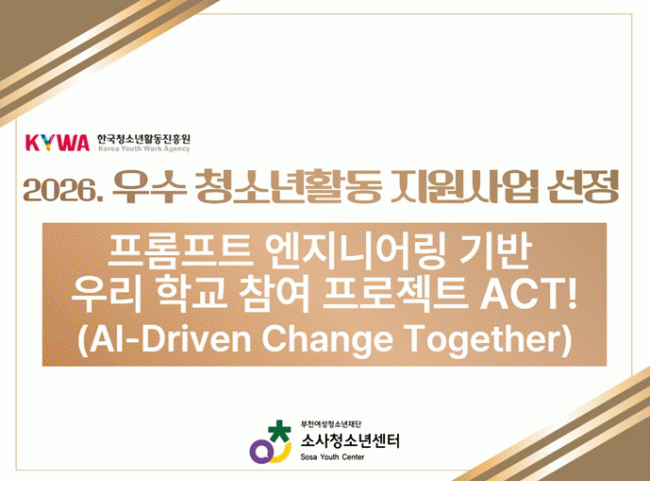 [NWS¹æ¼Û=Çѽ¸ñ ±âÀÚ]ºÎõ¿©¼ºÃ»¼Ò³âÀç´ÜÀÌ ¿î¿µÇÏ´Â ¼Ò»çû¼Ò³â¼¾ÅÍ´Â Çѱ¹Ã»¼Ò³âȰµ¿ÁøÈï¿øÀÌ ÁÖ°üÇÏ´Â ¡®2026³â ¿ì¼ö û¼Ò³âȰµ¿ ÇÁ·Î±×·¥ Áö¿ø»ç¾÷¡¯ AI¡¤µðÁöÅÐ ºÐ¾ß¿¡ ¼±Á¤µÆ´Ù°í ¹àÇû´Ù. º» »ç¾÷Àº Àü±¹ û¼Ò³â¼ö·Ã½Ã¼³ ´ë»óÀ¸¡¦