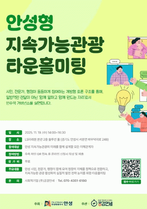 [NWS¹æ¼Û=Çѽ¸ñ ±âÀÚ]¾È¼º½Ã´Â ¿À´Â 11¿ù 19ÀÏ ¿ÀÈÄ 2½Ã LS¹Ì·¡¿ø¿¡¼­ ½Ã¹Î?Àü¹®°¡?ÇàÁ¤ÀÌ ÇÔ²² ¾È¼º °ü±¤ÀÇ ÇöÀç¿Í ¹Ì·¡¸¦ ³íÀÇÇÏ´Â '¾È¼ºÇü Áö¼Ó°¡´É°ü±¤ Ÿ¿îȦ¹ÌÆÃ'À» °³ÃÖÇÑ´Ù. À̹ø Ÿ¿îȦ¹ÌÆÃÀº Áö¼Ó°¡´É°ü±¤ Ȱ¼ºÈ­¸¦ À§ÇÑ ¿­¸°¡¦