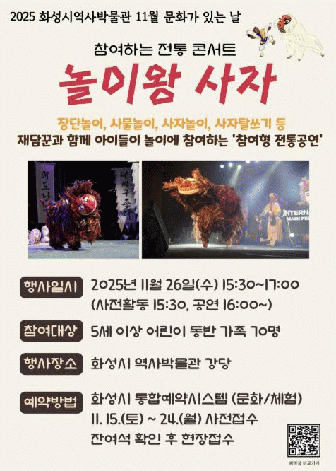 [»çȸ] È­¼º½Ã ¿ª»ç¹Ú¹°°ü, 11¿ù ¹®È­°¡ ÀÖ´Â ³¯ '³îÀÌ¿Õ »çÀÚ' ¿î¿µ |2025. 11.21