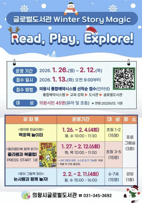 [NWS¹æ¼Û=Çѽ¸ñ ±âÀÚ]Àǿսà ±Û·Î¹úµµ¼­°ü(º¸½Ä°ñ·Î 30-10)ÀÌ ¿µ¾îÃ¥°ú ÇÔ²²ÇÏ´Â Áñ°Å¿î °Ü¿ï¹æÇÐÀ» º¸³¾ ¼ö ÀÖµµ·Ï À¯¾Æ, ÃʵîÇлý ´ë»ó Ưº° ÇÁ·Î±×·¥ 'Winter Story Magic: Read, Play, Explore!'¸¦ 1¿ù 26ÀϺÎÅÍ 2¿ù 12ÀϱîÁö ÁøÇàÇÑ¡¦