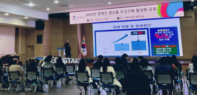 [NWS¹æ¼Û=Çѽ¸ñ ±âÀÚ]ÆòÅýô Áö³­ 5ÀÏ ½Ãû º»°ü 2Ãþ ´ëȸÀǽǿ¡¼­ ÆòÅýà °ø¹«¿øÀ» ´ë»óÀ¸·Î '2026³â Àå¾ÖÀλý»êǰ ¿ì¼±±¸¸Å Ȱ¼ºÈ­ ±³À°¡¯À» ½Ç½ÃÇß´Ù. À̹ø ±³À°¿¡´Â °¢ ºÎ¼­ ȸ°è ¹× ¹°Ç°±¸¸Å ´ã´çÀÚ¿Í À¾¸éµ¿ Àå¾ÖÀκ¹Áö ´ã´çÀÚ¡¦