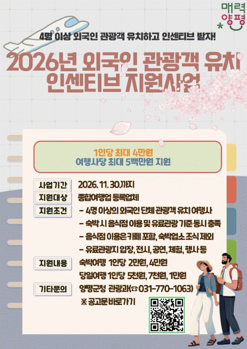 [NWS¹æ¼Û=Çѽ¸ñ ±âÀÚ]¾çÆò±ºÀº ¿Ü±¹ÀÎ °ü±¤°´ À¯Ä¡¸¦ ÃËÁøÇϰí ħüµÈ Áö¿ª °ü±¤»ê¾÷¿¡ Ȱ·ÂÀ» ºÒ¾î³Ö±â À§ÇØ ¡®2026³â ¾çÆò±º ¿Ü±¹ÀÎ °ü±¤°´ À¯Ä¡ Àμ¾Æ¼ºê Áö¿ø»ç¾÷¡¯À» ÃßÁøÇÑ´Ù°í ¹àÇû´Ù. À̹ø »ç¾÷Àº ¡®°ü±¤ÁøÈï¹ý¡¯¿¡ µû¶ó µî·ÏµÈ¡¦