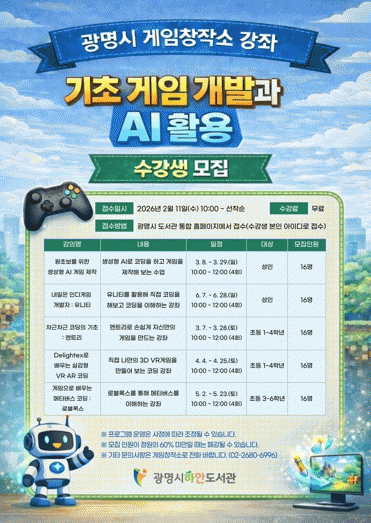 [»çȸ] ±¤¸í½Ã °ÔÀÓâÀÛ¼Ò, ¡®±âÃÊ °ÔÀÓ °³¹ß°ú AI Ȱ¿ë¡¯ »ó¹Ý±â °­Á ¼ö°­»ý ¸ðÁý |2026. 02.08